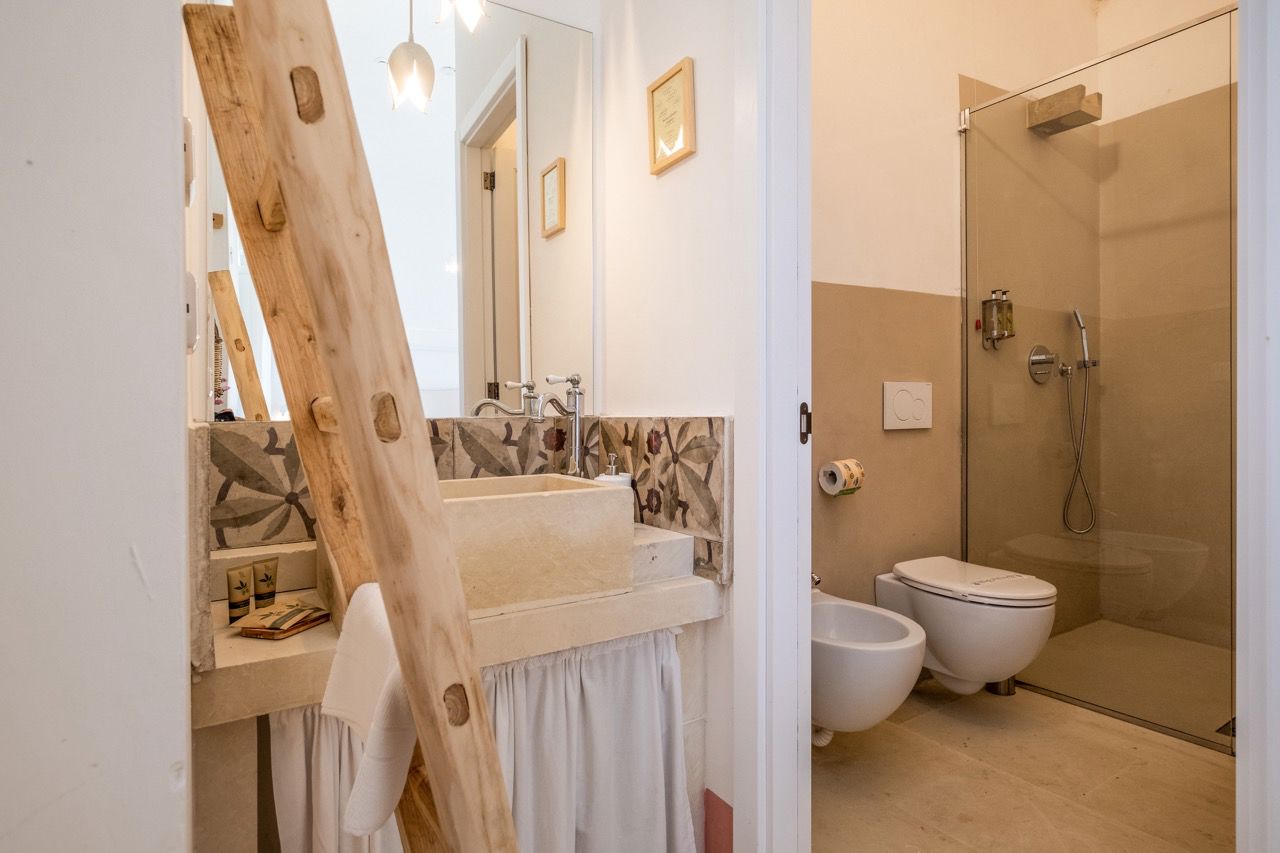 The meticulous renovation has transformed the ancient stables of the masseria into refined Deluxe Rooms, preserving original features, such as the feeding troughs in some rooms, reimagined as sinks, which tell the authentic story of the property. Large windows flood the spaces with natural light, highlighting the warm and welcoming atmosphere. At the center of the room stands the rustic, handcrafted wooden bed, ensuring a restorative sleep. Spacious, bright bathrooms feature Lecce stone floors and details, combining authenticity and style.